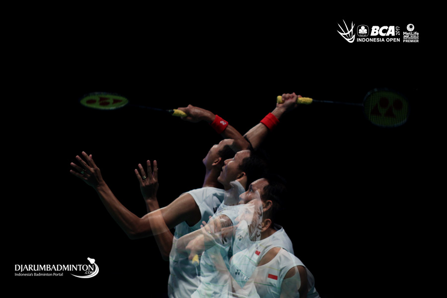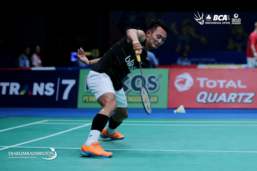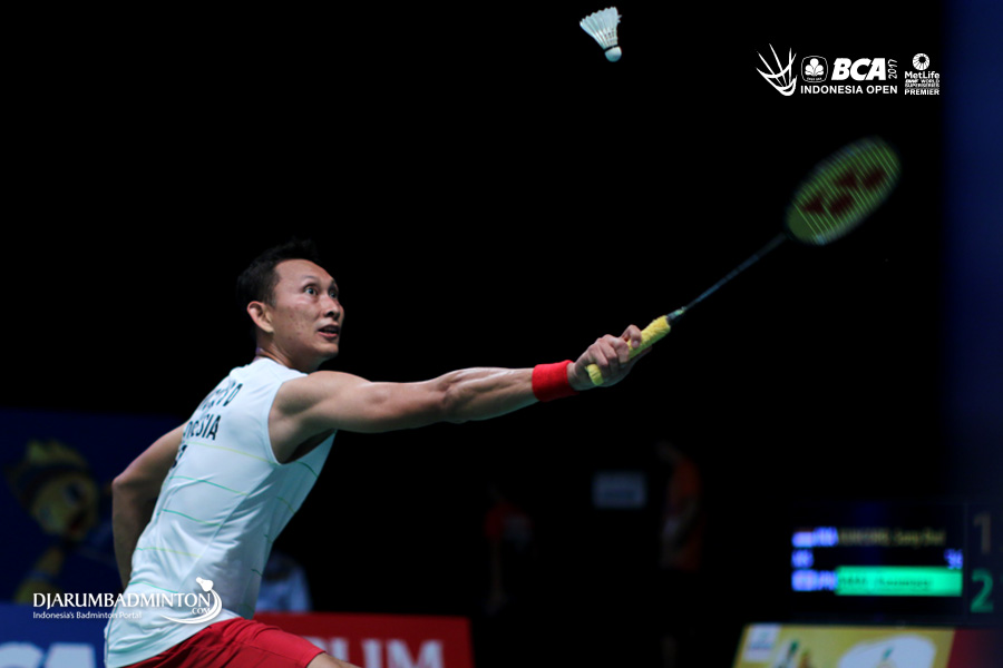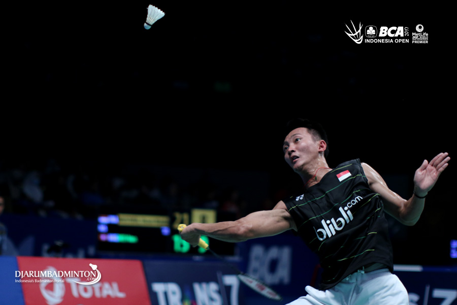 Sony Dwi Kuncoro (Indonesia) mengembalikan shuttlecock