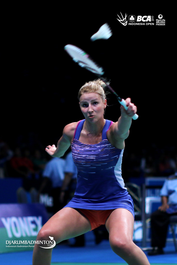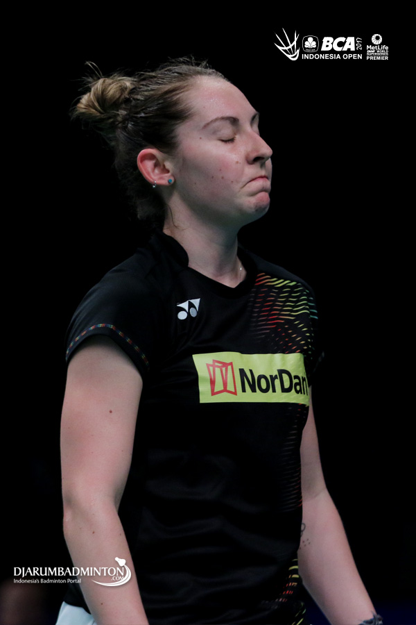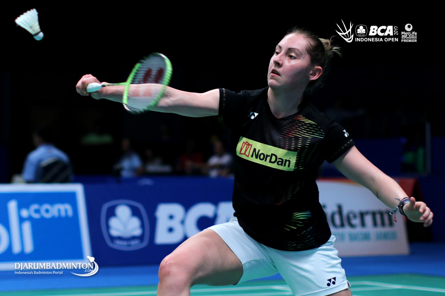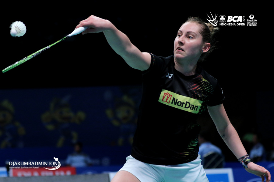 Kirsty Gilmour (Skotlandia) mengembalikan shuttlecock