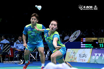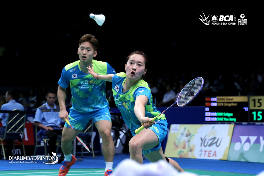 Solgyu Choi/Chae Yoo Jung (Korea) mengembalikan shuttlecock.