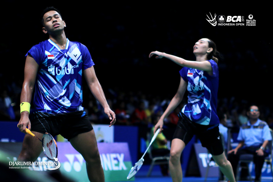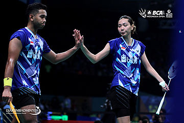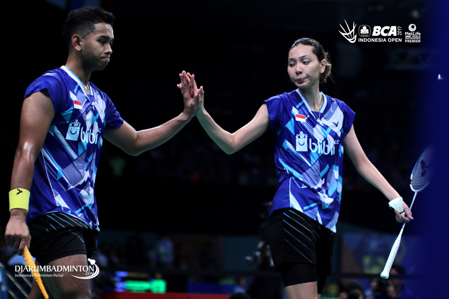 Edi Subaktiar/Gloria Emanuelle (Indonesia) saling memberikan semangat saat bertanding.