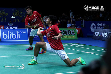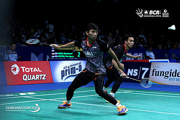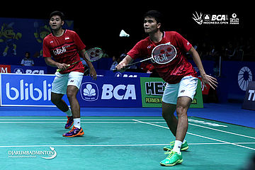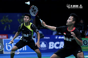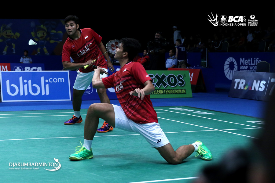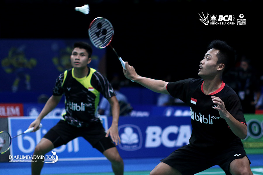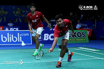 Angga Pratama/Ricky Karanda Suwardi (Indonesia) menyambut pengembalian