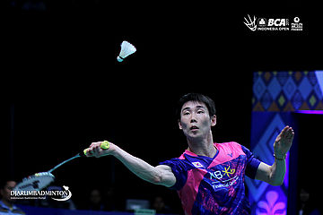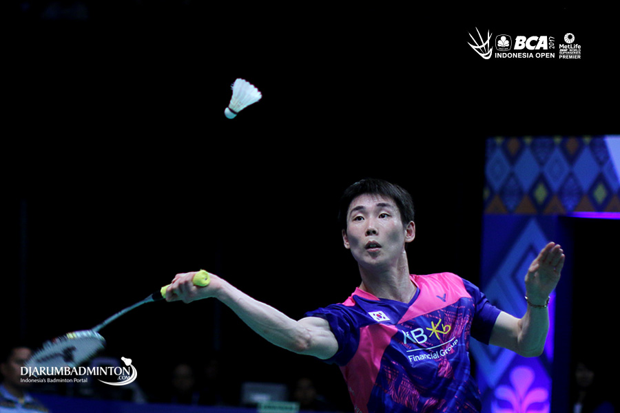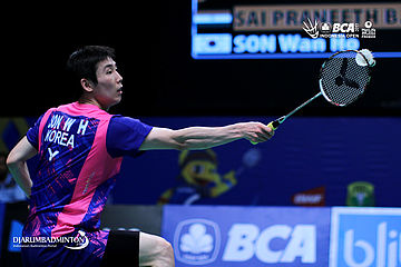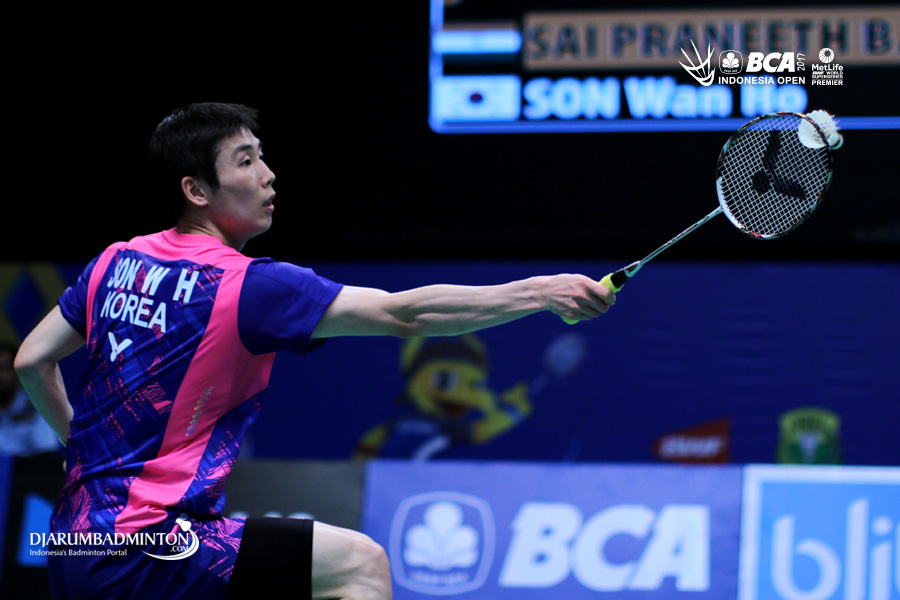 Son Wan Ho (Korea) mengembalikan shuttlecock