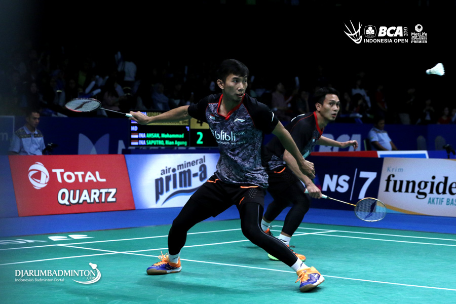 Mohammad Ahsan/Rian Agung (Indonesia) bersiap menghadang serangan