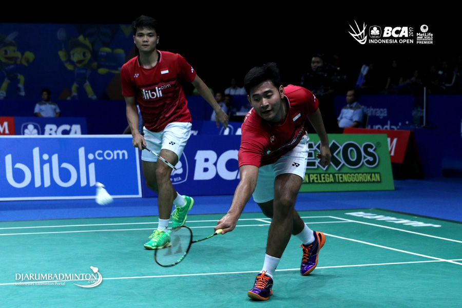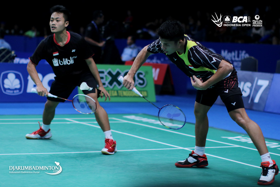 Angga Pratama/Ricky Karanda Suwardi (Indonesia) menghadang serangan