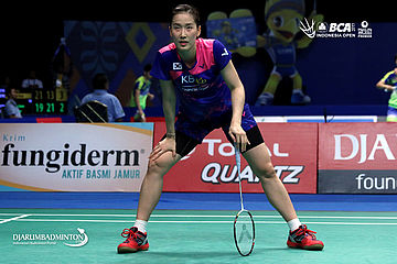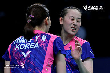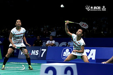Della Destiara Haris/Rosyita Eka Putri Sari (Indonesia) bersiap menyambut pengembalian