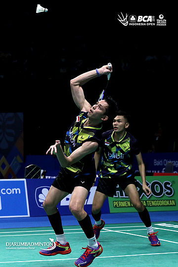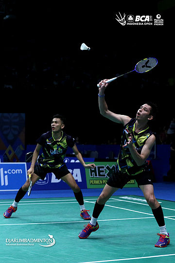 Fajar Alfian/Muhammad Rian Ardianto (Indonesia) bersiap menyambar pengembalian