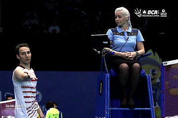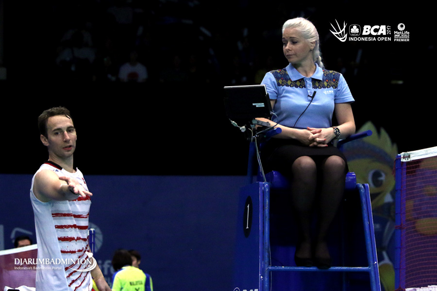Mathias Boe (Denmark) melakukan protes kepada umpire