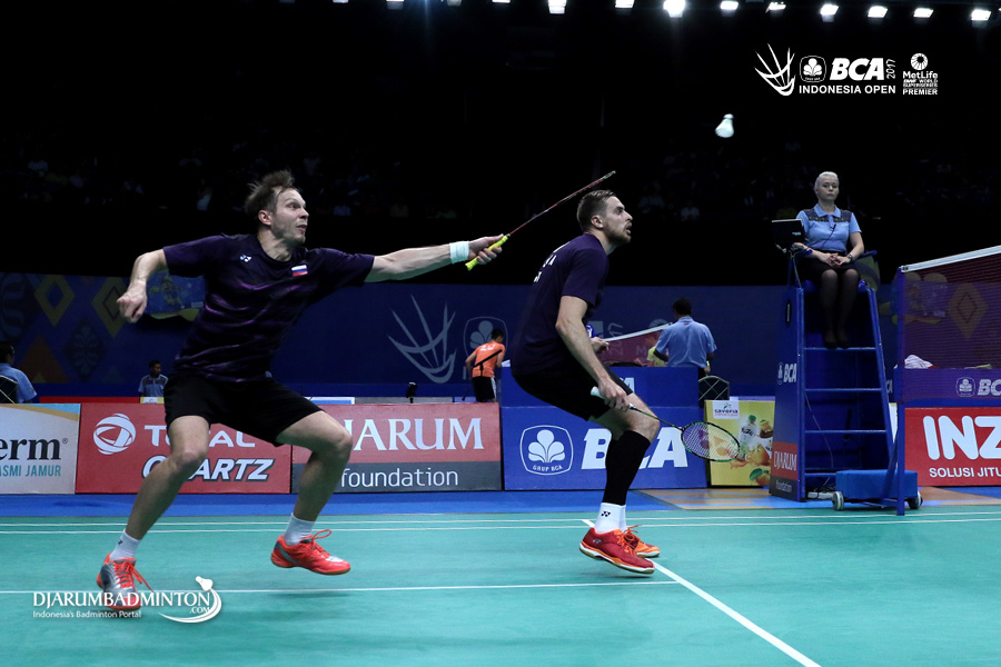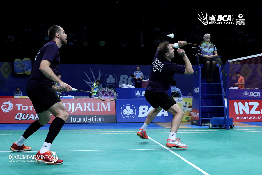 Ivan Sozonov/Vladimir Ivanov (Rusia) mengembalikan shuttlecock