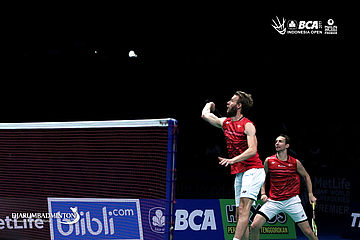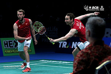 Carsten Mogensen/Mathias Boe (Denmark) bersiap melepaskan serangan