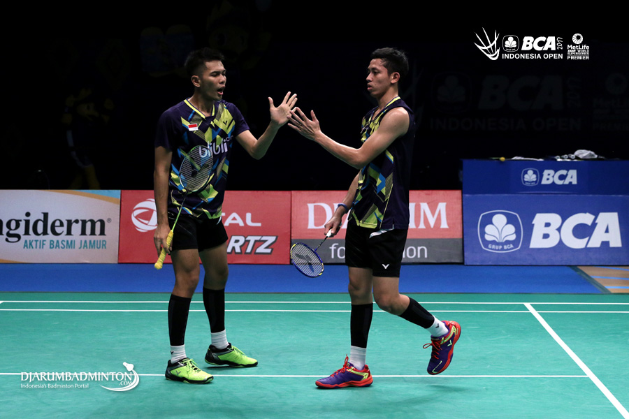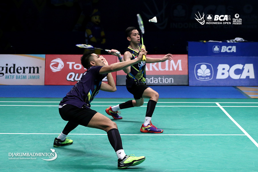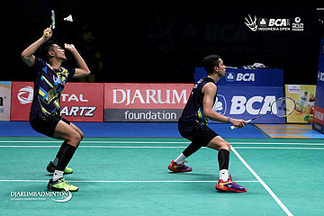 Fajar Alfian/Muhammad Rian Ardianto (Indonesia) bersiap menyambar pengembalian