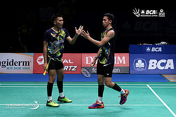 Fajar Alfian/Muhammad Rian Ardianto (Indonesia) saling memberikan semangat