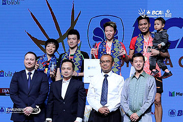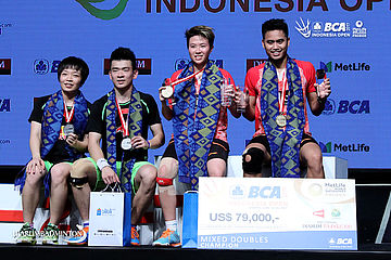 Runner up Zheng Siwei/Chen Qingchen (Tiongkok) dan juara ganda putra BCA Indonesia Open Superseries Premier 2017, Tontowi Ahmad/Liliyana Natsir (Indonesia) berfoto bersama di podium.