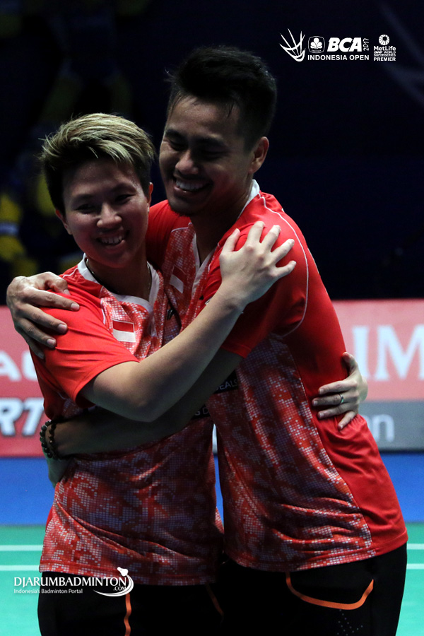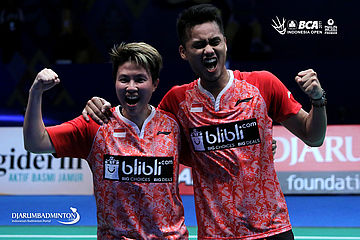 Selebrasi kemenangan Tontowi Ahmad/Liliyana Natsir (Indonesia)
