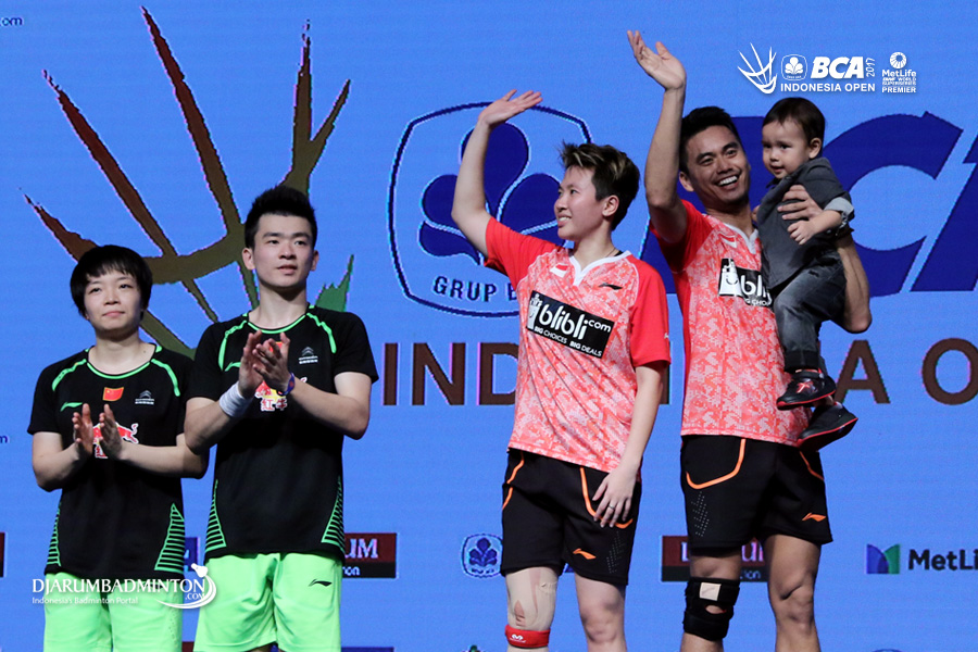 Runner up Zheng Siwei/Chen Qingchen (Tiongkok) dan juara ganda putra BCA Indonesia Open Superseries Premier 2017, Tontowi Ahmad/Liliyana Natsir (Indonesia) berfoto bersama di podium
