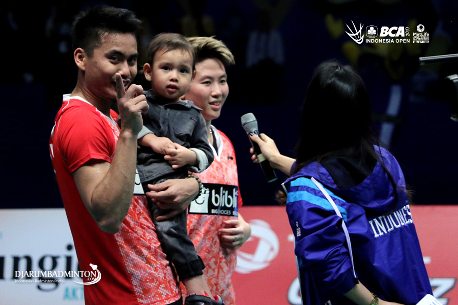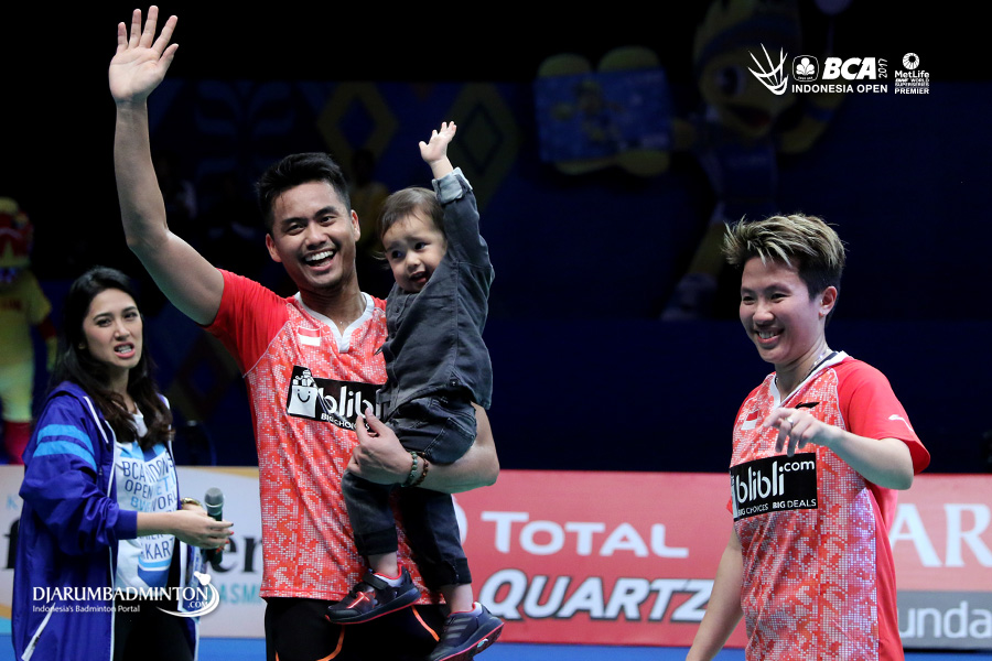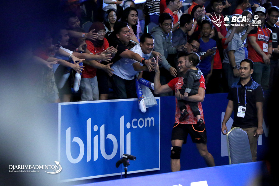 Selebrasi kemenangan Tontowi Ahmad (Indonesia) bersama putranya