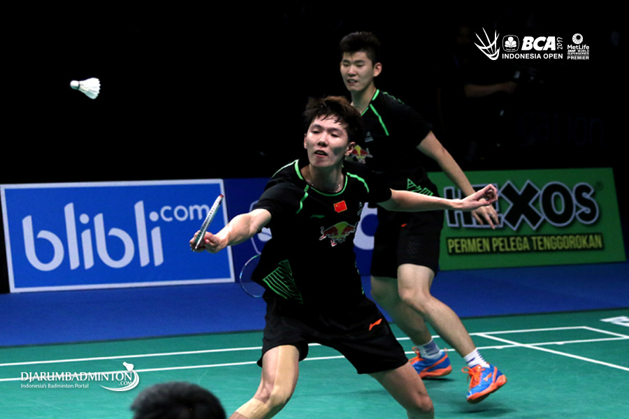 Li Junhui/Liu Yuchen (Tiongkok) mengembalikan shuttlecock