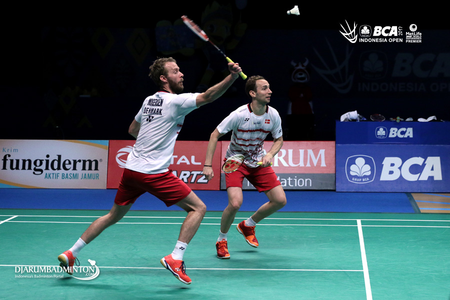 Mathias Boe/Carsten Mogensen (Denamark) bersiap menyambar pengembalian
