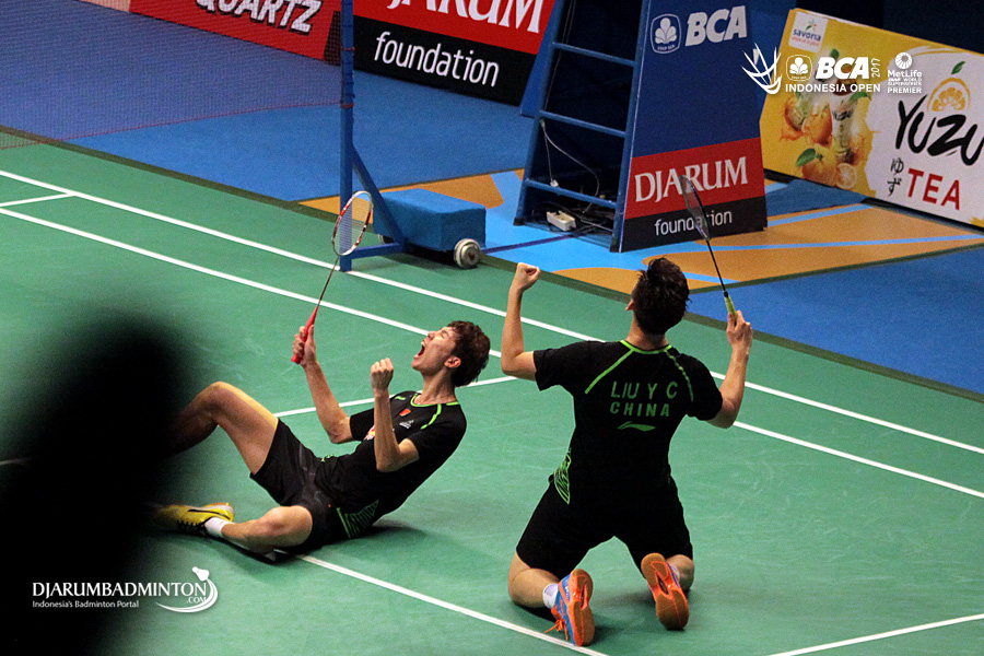 Selebrasi kemenangan Li Junhui/Liu Yuchen (Tiongkok)