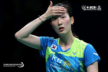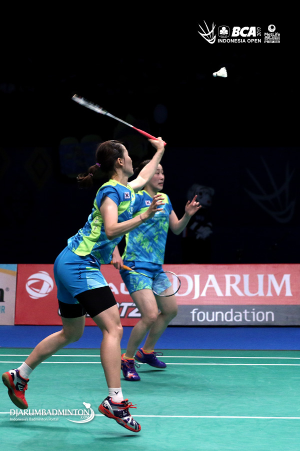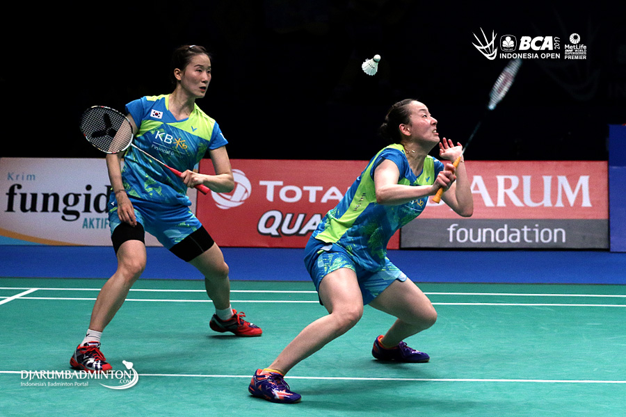 Chang Ye Na/Lee So Hee (Korea) bersiap menghadang serangan