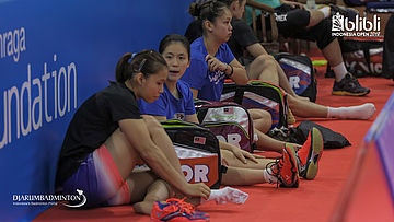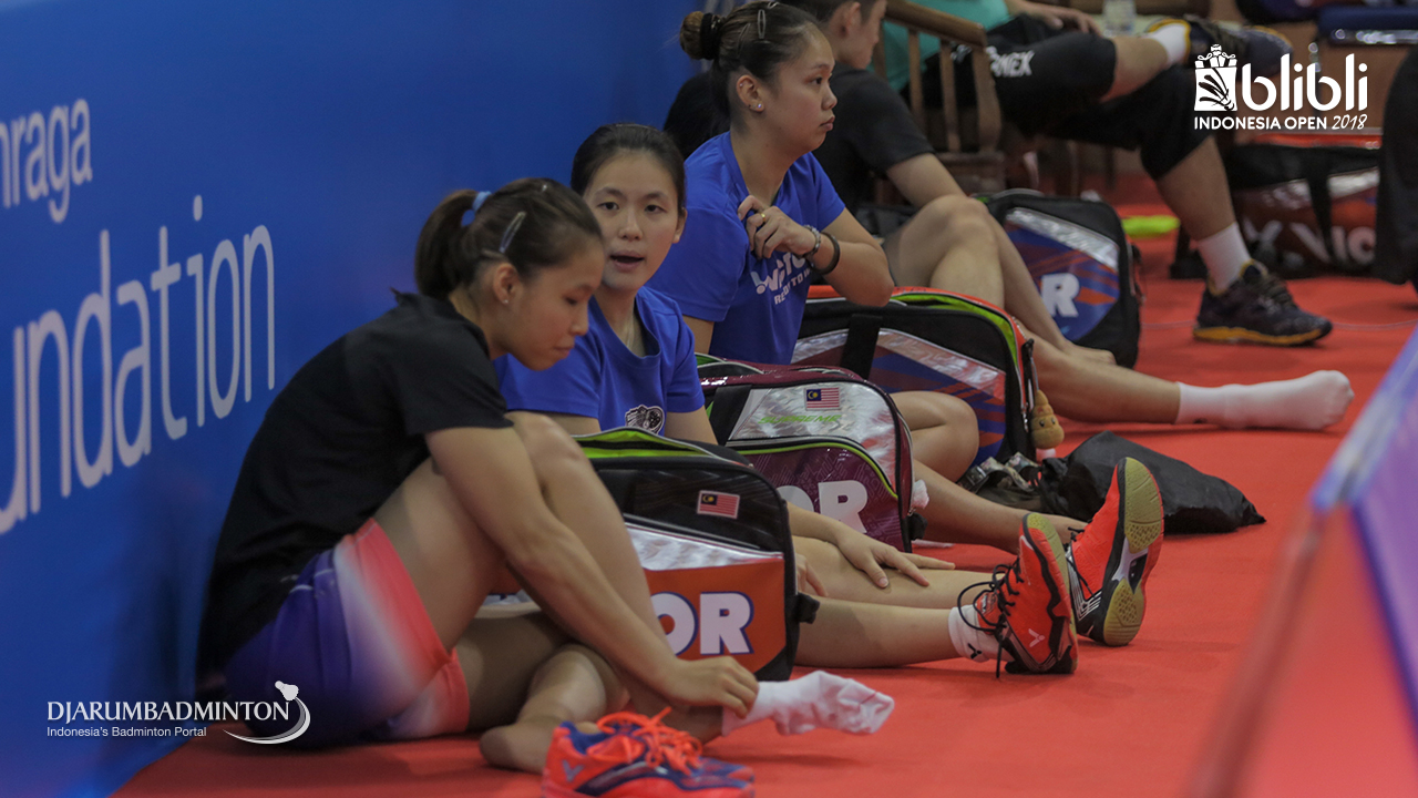 Pebulutangkis wanita malaysia bersiap melakukan latihan