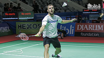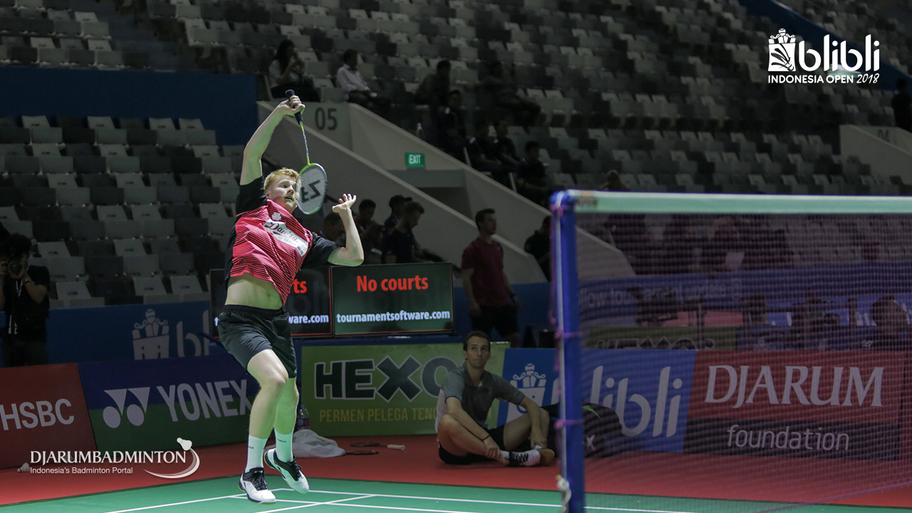Anders Antonsen (Denmark) mengembalikan shuttlecock