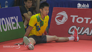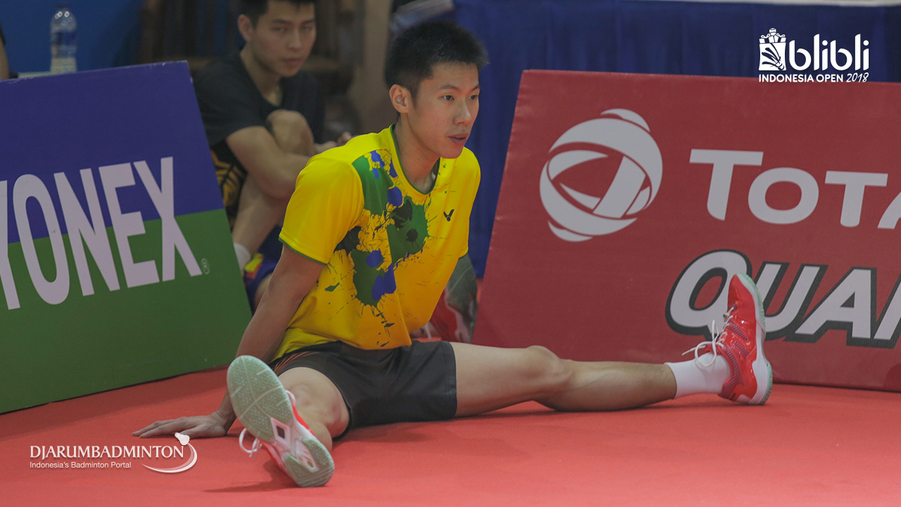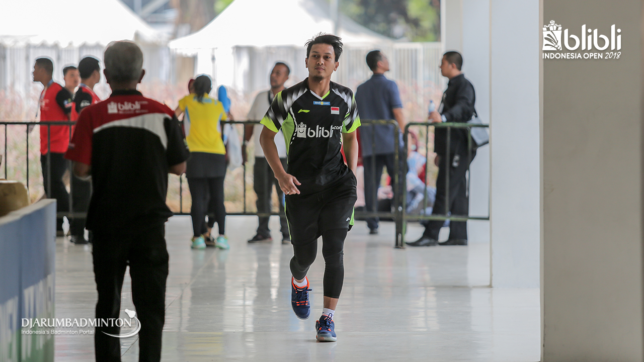 Mohammad AHSAN (Indonesia) melakukan pemanasan