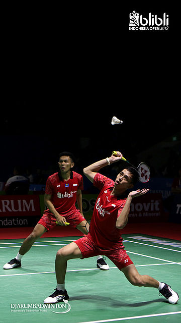 Marcus Fernaldi Gideon/Kevin Sanjaya Sukamuljo (INA) berusaha menggapai pengembalian
