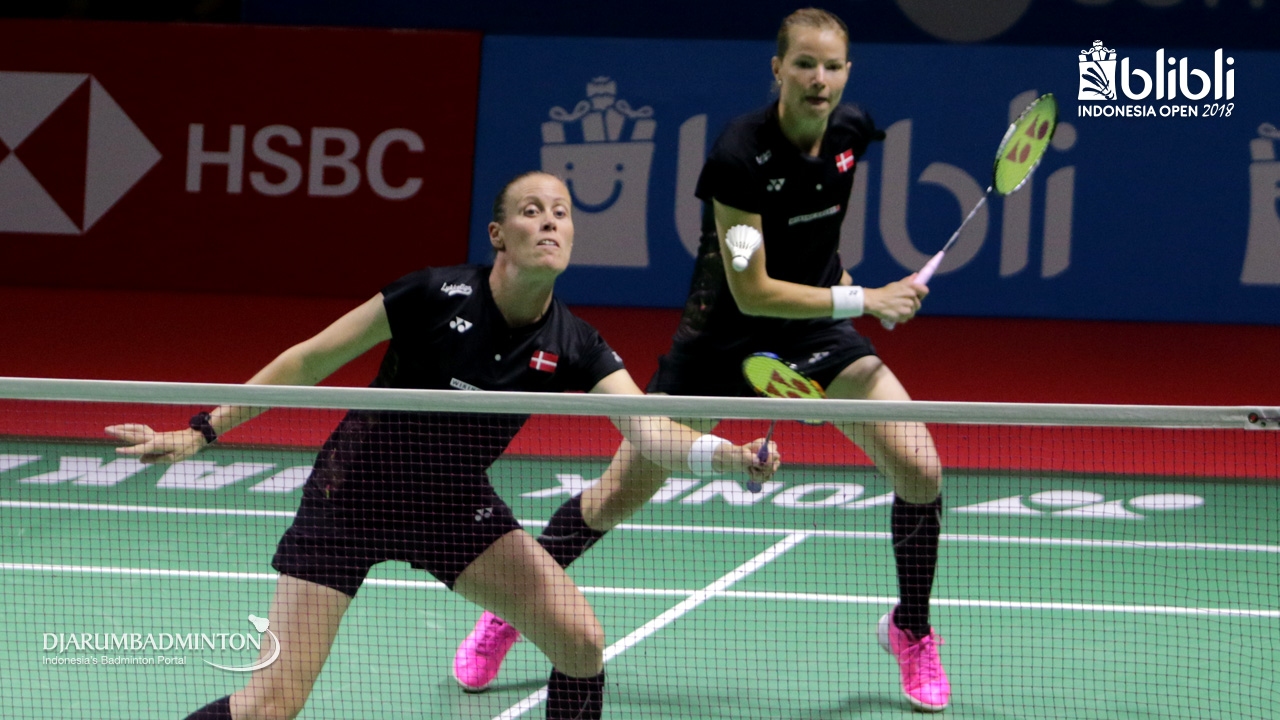 Kamilla Rytter Juhl/Christinna Pedersen (DEN) melepaskan serangan