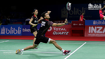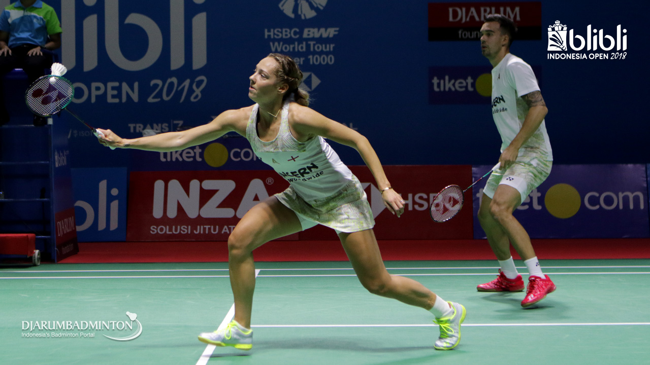 Chris Adcock/Gabrielle Adcock (ENG) saling berkoordinasi di lapangan.