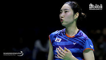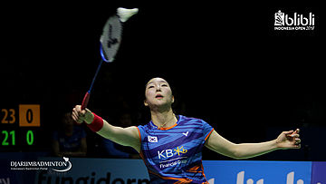 Sung Ji Hyun (KOR) mengembalikan shuttlecock.