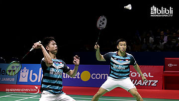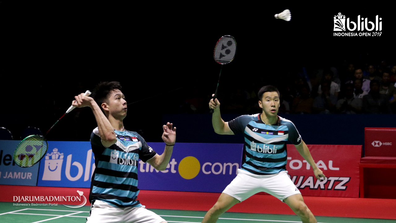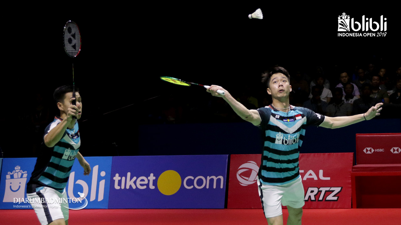 Marcus Fernaldi Gideon/Kevin Sanjaya Sukamuljo (INA) menyambut pengembalian