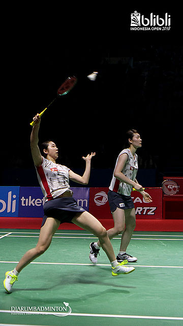 Yuki Fukushima/Sayaka Hirota (JPN) menghindari serangan lawan.
