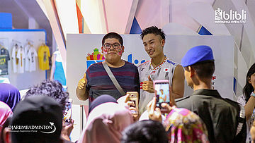 Kento MOMOTA (Jepang) berfoto bersama pengunjung
