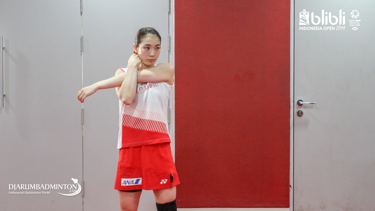 Misaki Matsutomo melakukan pemanasan di Players Services