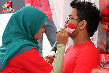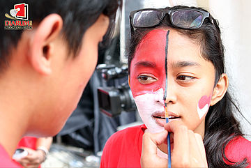 Untuk mendukung pemain Indonesia yang berlaga, seorang suporter mengecat mukanya di area face painting yang berada di area Istora Senayan Jakarta.