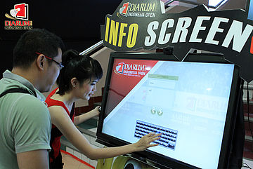 Seorang pengunjung tengah mendapat penjelasan Info Screen dari usher yang bertugas di Istora Senayan Jakarta.
