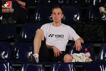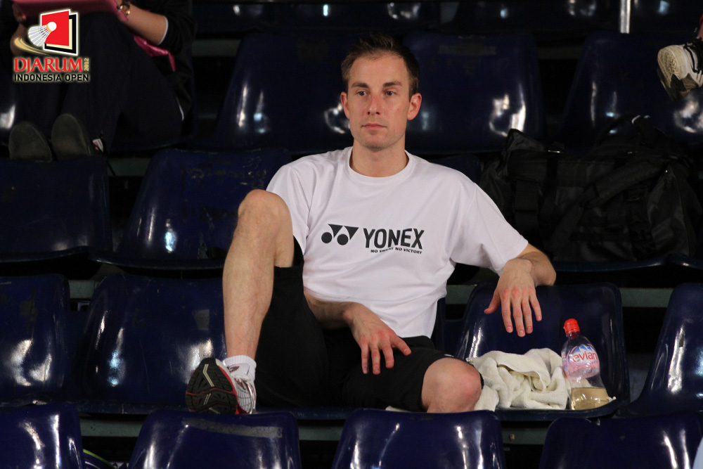 Pemain unggulan asal Denmark, Peter Hoeg Gade menyaksikan pertandingan babak kualifikasi pertama Djarum Indonesia Open 2012.