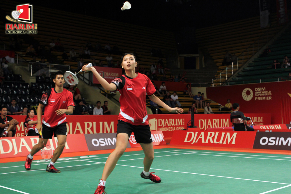Pasangan ganda campuran Indonesia, Gloria Emmanule (kanan) dan rekannya, Alfian Eko Prasetya berusaha mengembalikan kok ke arah pasangan asal PB Djarum Putra Arsya Isnanu/Surya Della di babak kualifikasi pertama Djarum Indonesia Open 2012.