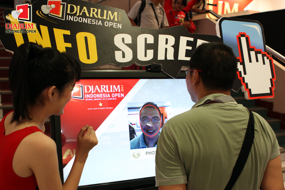 Seorang pengunjung mencoba aplikasi foto yang berada di Info Screen yang terletak di Istora Senayan Jakarta.