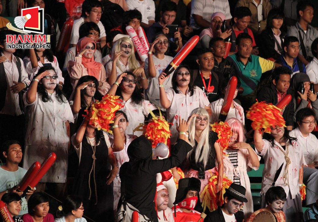 Aksi suporter Indonesia yang memakai atribut seperti zombie kala menyaksikan ronde kedua Djarum Indonesia Open 2012.