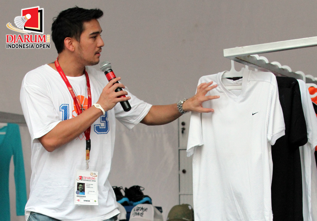 Artis Indonesia, Mario Lawalata ketika tengah memberikan sambutan di depan booth miliknya di Celebrity Bazaar, Djarum Indonesia Open 2012.