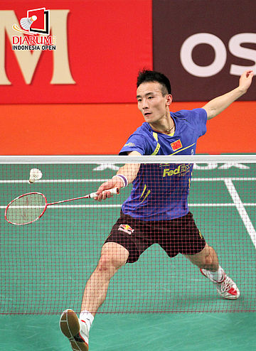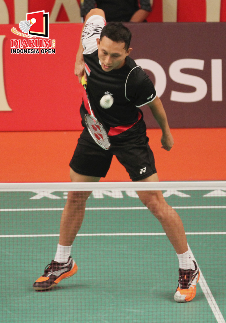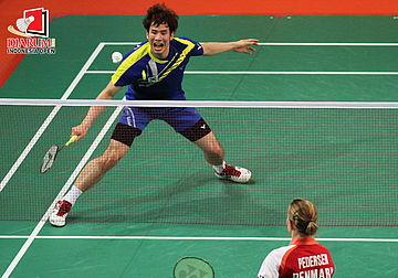 Pemain China, Du Pengyu berusaha mengembalikan kok ke arah pemain Indonesia, Sony Dwi Kuncoro.