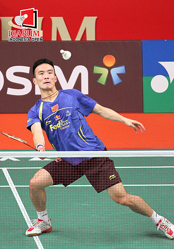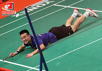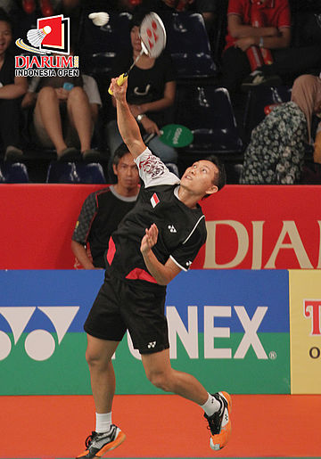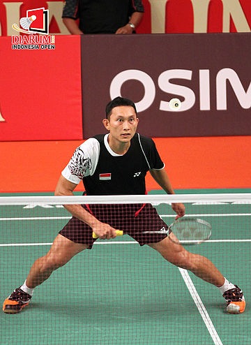 Pemain Indonesia, Sony Dwi Kuncoro berusaha mengembalikan kok ke arah pemain China, Du Pengyu