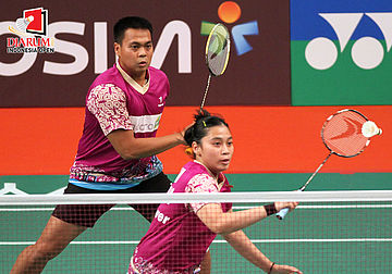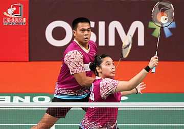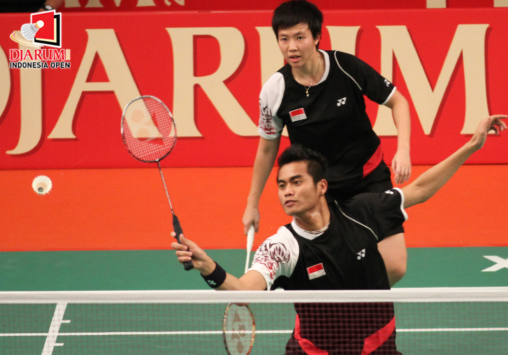 Pemain ganda campuran Indonesia, Markis Kido/Pia Zebadiah berusaha memukul kok ke arah pasangan Indonesia, Tontowi Ahmad/Liliyana Natsir