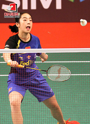 Pemain China, Wang Shixian berusaha mengembalikan kok ke arah pemain India, Saina Nehwal.