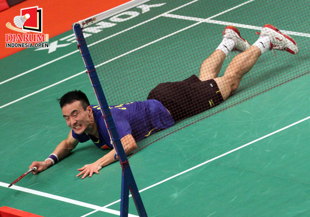 Pemain China, Du Pengyu terjatuh ketika berhadapan kontra pemain Indonesia, Sony Dwi Kuncoro.