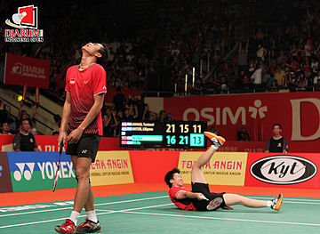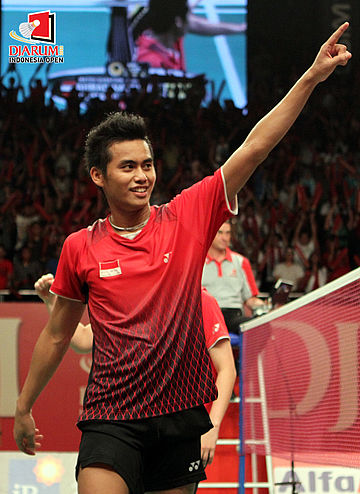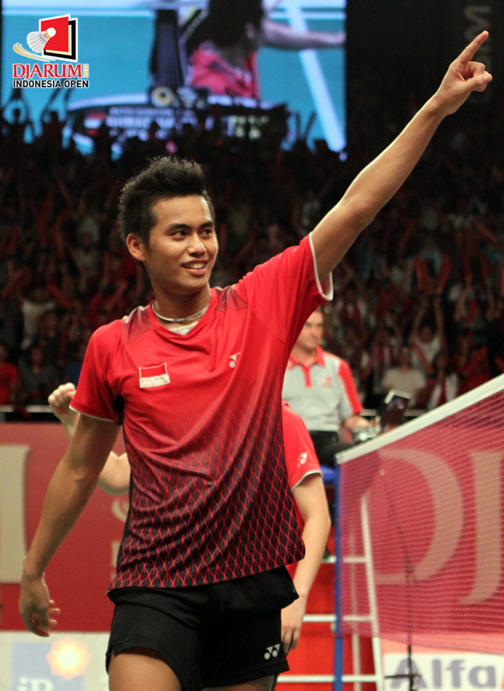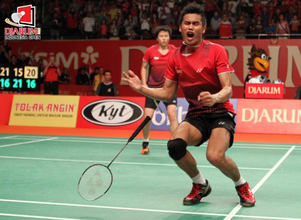 Ekspresi kemenangan pemain Indonesia, Tontowi Ahmad usai mengalahkan pasangan China, Xu Chen/Ma Jin.