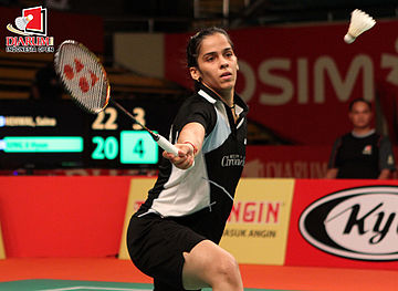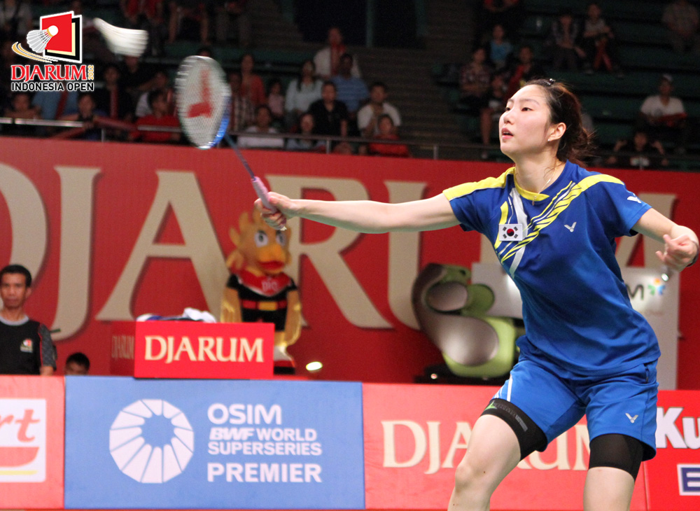 Pemain India, Saina Nehwal berusaha mengembalikan kok ke arah pemain Korea Selatan, Sung Ji Hyun.