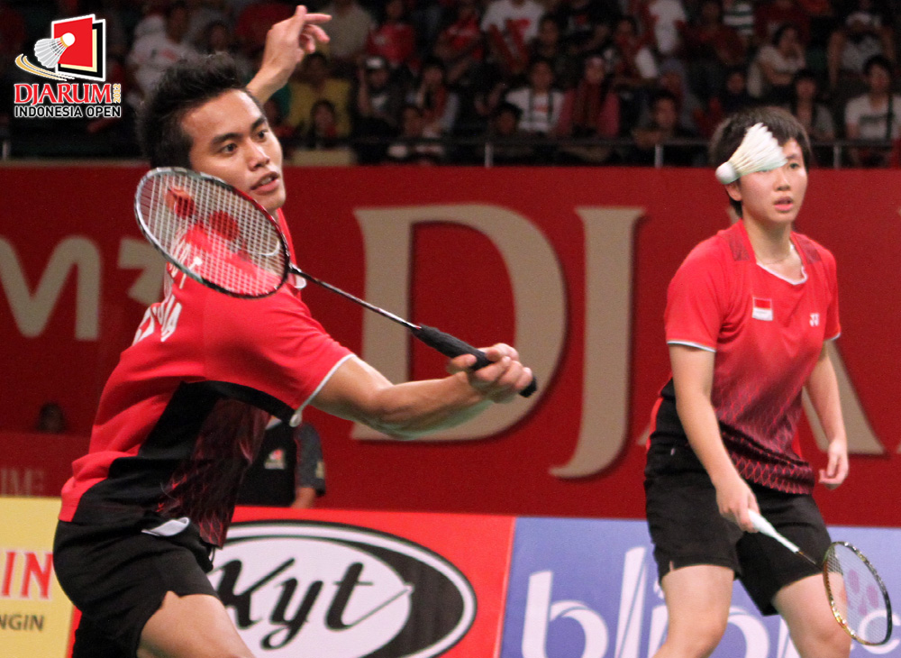 Pasangan Indonesia, Tontowi Ahmad/Liliyana Natsir berusaha mengembalikan kok ke arah pasangan China, Xu Chen/Ma Jin.