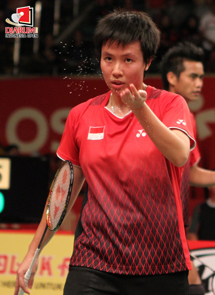 Pemain Indonesia, Liliyana Natsir mengelap keringat ketika melawan pasangan China, Xu Chen/Ma Jin.